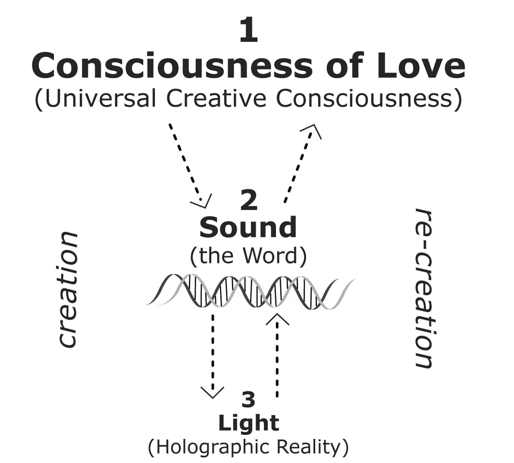 Figure 1 depicts how the Creator utters—consciously, energetically, and literally—the holographic construct of the world into existence. This illustration also shows how we ourselves can re-create our reality construct, starting at the ener-genetic level.